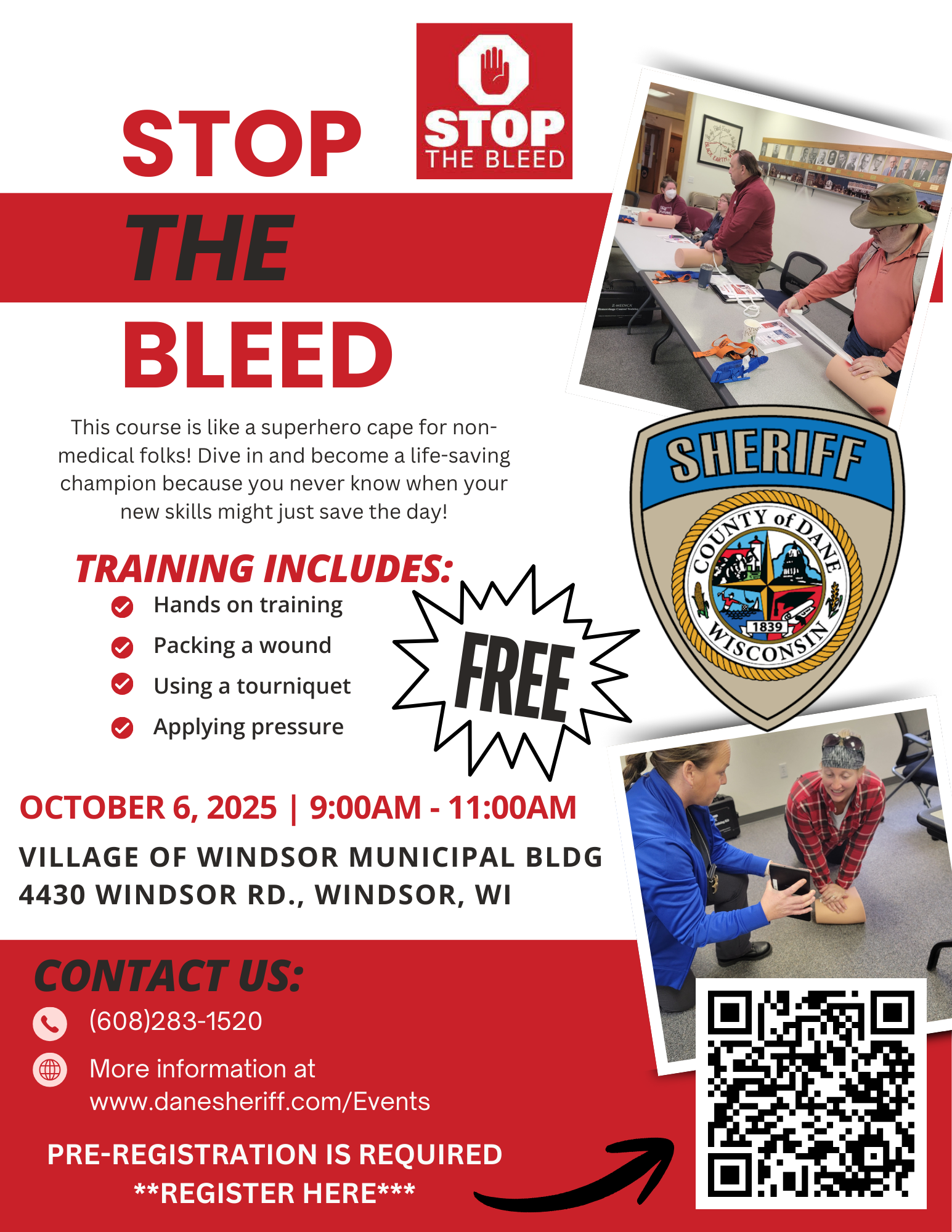 The Dane County Sheriff’s Office is hosting a FREE Stop The Bleed Course at the Windsor Municipal Building on Monday, October 1st, 2025.  This course is like a superhero cape for non-medical folks!  Dive in and become a life-saving champion because you never know when your new skills might just save the day!  The training includes: hands on training, applying pressure, packing a wound and using a tourniquet.