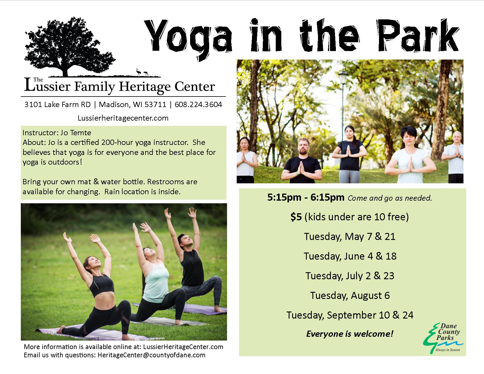 Bring your own mat & water bottle. Restrooms are available for changing. Rain location is inside the Heritage Center.